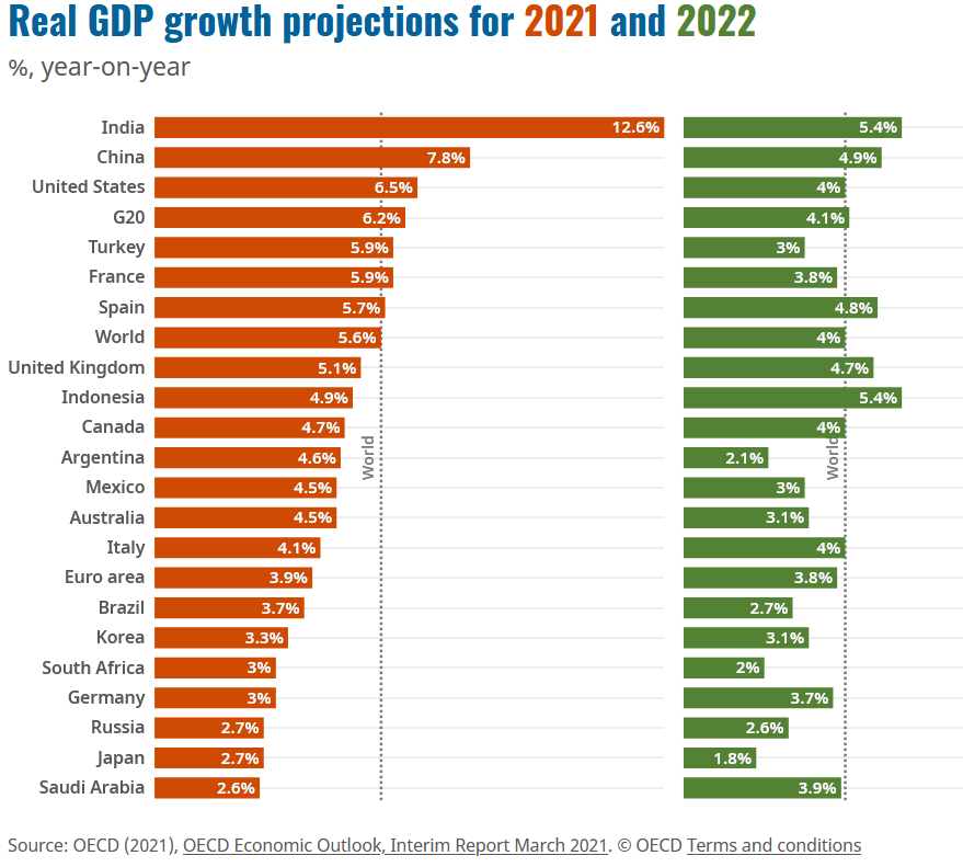 Laten we bij het rapport van het IMF beginnen. Barstensvol van alle eventuele risico’s en kansen, weet het IMF een indicatie te geven dat we er, gelukkig, aardig op vooruitgaan in de komende paar jaar. Vooral in de tweede helft van 2021 schatten ze in dat de groei enorm aan zal trekken, wanneer de vaccinaties grotendeels gezet zijn, we weer veilig open kunnen, en dus weer veel gaan handelen en consumeren. Toch geven ze ook aan dat er langere risico’s zijn, ‘littekens’, doordat een hoop mensen hun werk hebben verloren of anderzijds, met steun, alsnog geen werkervaring opdeden. Hetzelfde geldt voor het onderwijs, waarbij we helaas als samenleving moeten constateren dat we allemaal nét een tikkeltje minder slim werken dan anderzijds was gebeurd. Als aanrader voor beleidsmakers wordt vooral gemikt op fiscale maatregelen om men op de korte termijn gezond te maken/houden, bedrijven overeind te houden (zelfs als dit betekent dat zombiebedrijven overeind worden gehouden), en consumptiepatronen grofweg in stand te laten houden. Op de middellange termijn moet echter wel de nadruk liggen op het verhogen van de economische output, digitalisering, en verduurzaming. De OESO (of in het Engels: OECD) komt eigenlijk met heel vergelijkbare cijfers en advies. Er zijn nog veel kwetsbare plekken in de financiële markten, en de overheid moet vooral de consumptie blijven stutten en gericht ondersteuning bieden. Tot slot ook weer van hen de grote olifant in de kamer: Versnel het vaccineren en investeer in je mensen zelf. En dan hopen we maar dat er geen onvoorspelbare, vervelende shocks bij komen.